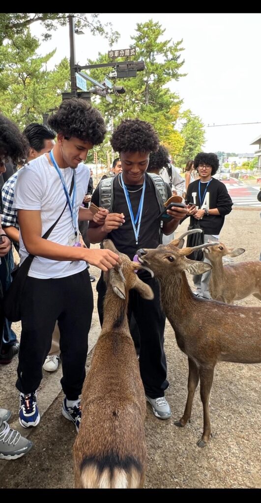 This morning we went to breakfast at 7:15 on the 21st floor. The view was amazing and we were able to see the city from there. After that we took the bus to Nara deer park where the deers roam around freely, even cross the crosswalks! You can feed them special crackers, they really love them. It was a fun experience and I would love to do it again.