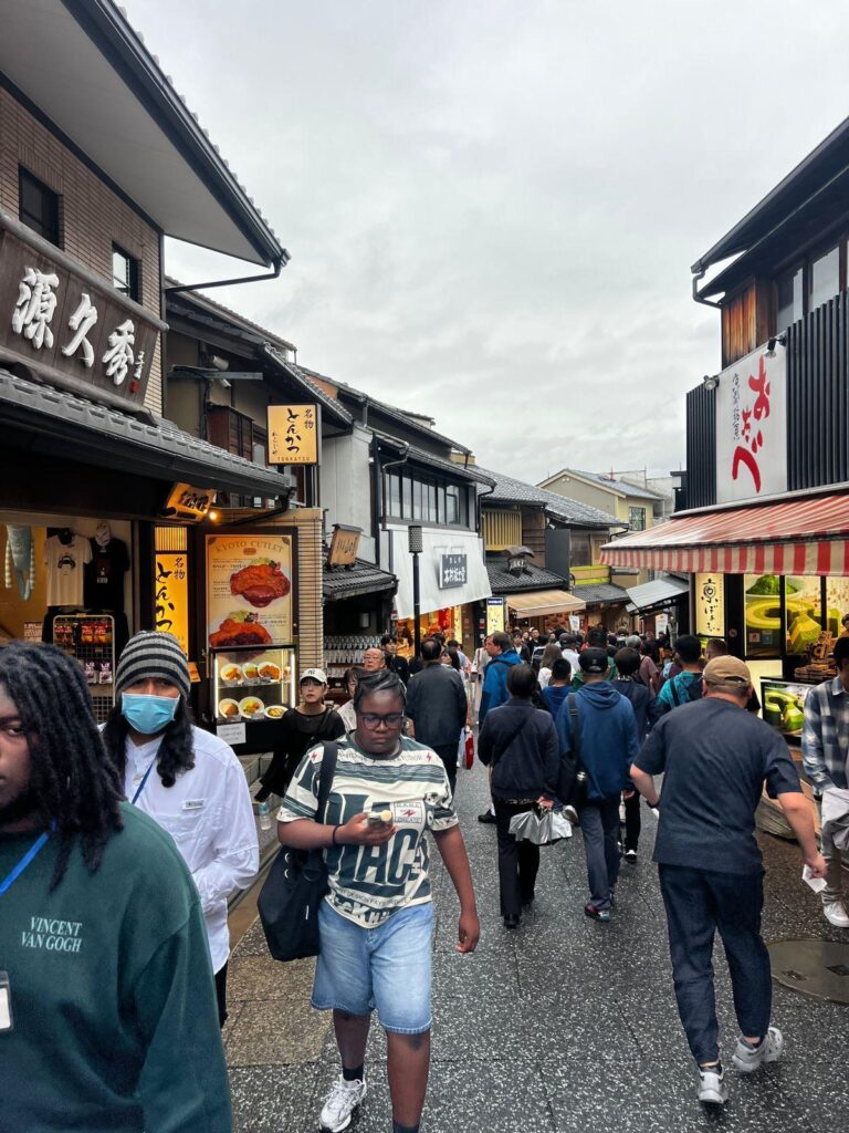 In the afternoon we then visited a huge, beautiful temple in the old part of Kyoto made without any nails. The name of the temple was Kiyomizu-dera Temple. Our tour guide gave us great insight into how it was made and the meaning behind the colors: pink and white for spring cherry blossoms, green for summer’s lush foliage, and fiery red, orange, and yellow for autumn leaves, symbolizing renewal and vitality. With little time to spare, we were able to go grab some gifts for our family and friends.
