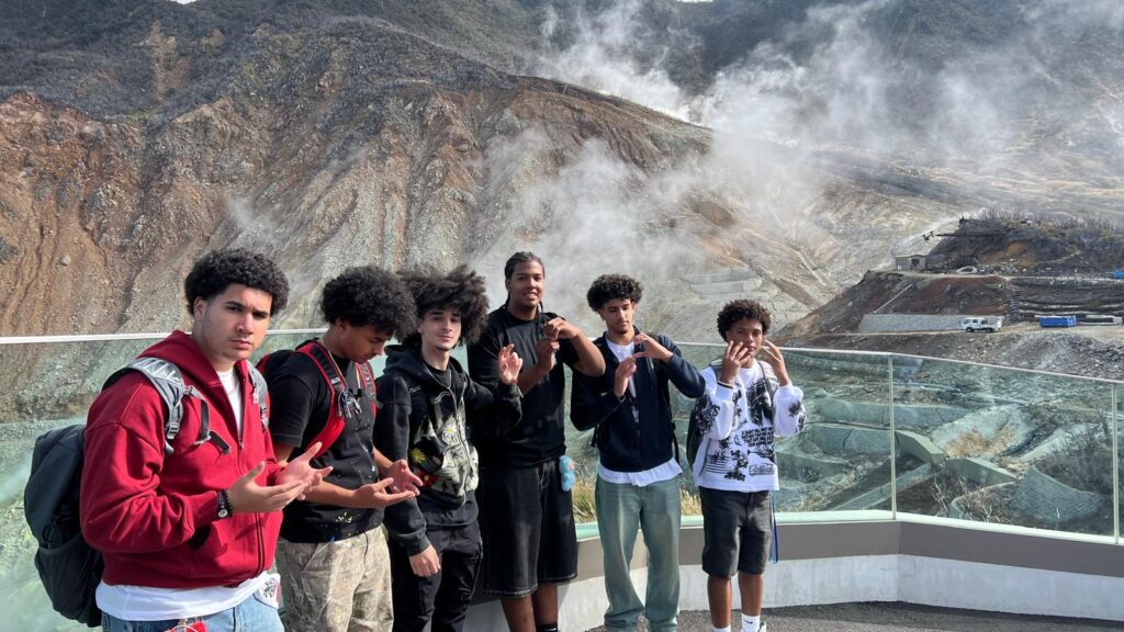 When we arrived, we had a good lunch before heading to Hakone Volcano. The view of Mount Fuji was amazing and looked unreal. We took a gondola up the mountain and the smell hit us right away. It smelled like eggs because of the sulfur in the air. At the top there was a shop that sold black eggs which are boiled in volcanic water. The shells turn black and people say eating one adds seven years to your life. A couple of us had the eggs so we will be fine for another while.