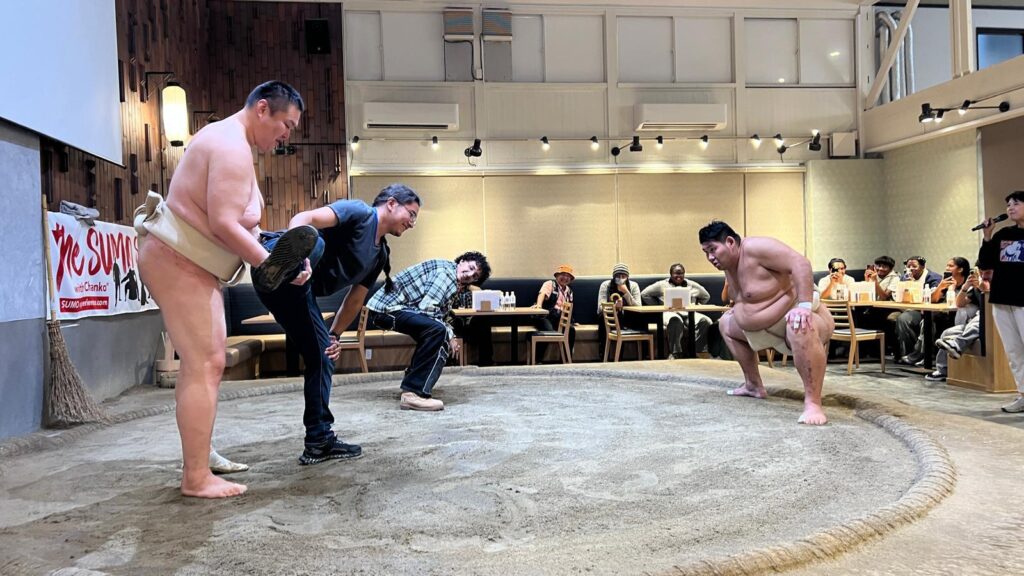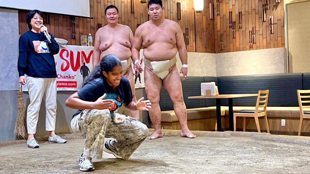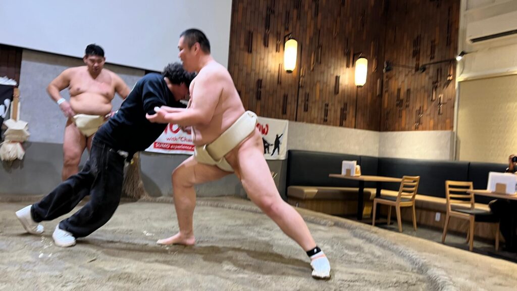 Afterwards, we went to see a sumo demonstration. It was impressive and explained the history and purpose of various aspects of the sport and its place in Japanese culture. After the demonstration, they challenged the students and staff to push the wrestlers out of the ring, only the head of the history department, Dr. Johnson, won. From there we went to a Japanese set dinner for a big dinner all together, at a really nice place. The view was amazing and we had a spectacular sunset as we ate. Then we boarded the bus to the hotel.