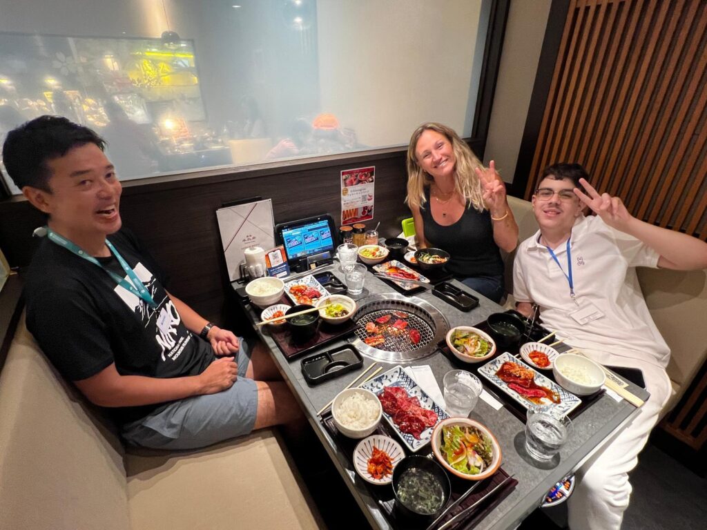 Then we took a bus ride over to the Fun Fun Plaza and took the elevator to the top of the Umeda Sky building. From there we could see the Osaka Skyline and we watched the sun set. Afterwards, we went to eat at a Korean barbecue place called Chiyayamachi. It was all we could eat and we cooked the vegetables and meat ourselves at the tables, it was fun and we tried lots of different things.