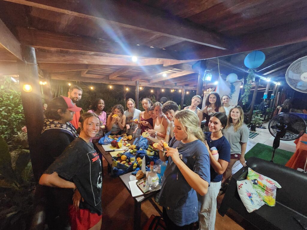 Our next stop was next day, at “Parismina kitchen”, where students took a walking tour of Parismina’s downtown, visiting key places like the ASTOP turtle conservation facilities, and short after that, they learned how to prepare traditional empanadas and copos (shaved ice) under the guidance of local cooks at their homes. Hands got messy, spices filled the air, and the atmosphere buzzed with curiosity and laughter. After all that hard work, we refreshed ourselves with amazing smoothies.