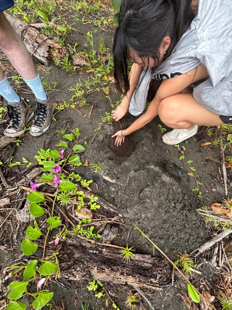 Short after that, students started creating our community agreements, things like using kind language, Pura Vida attitudes, respecting the Home Base dog, and playing cards every night. During our activity, Jason called us for an exciting surprise… leatherback hatchlings at the beach! We watched them crawl to the sea to start their life.