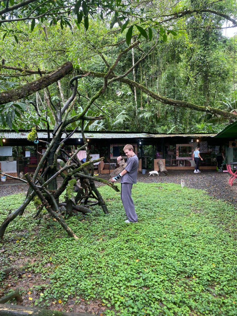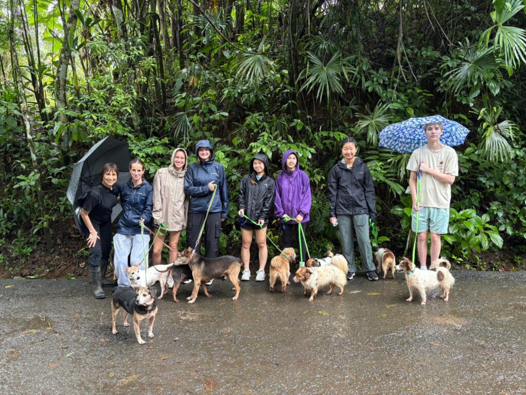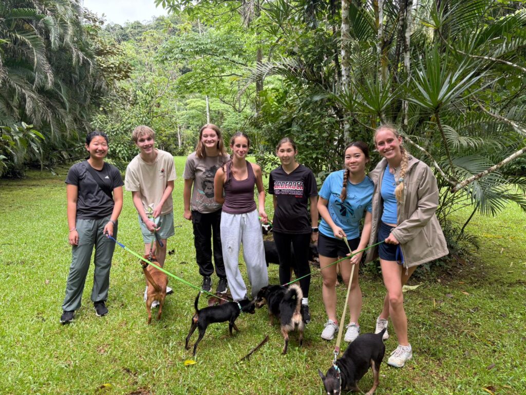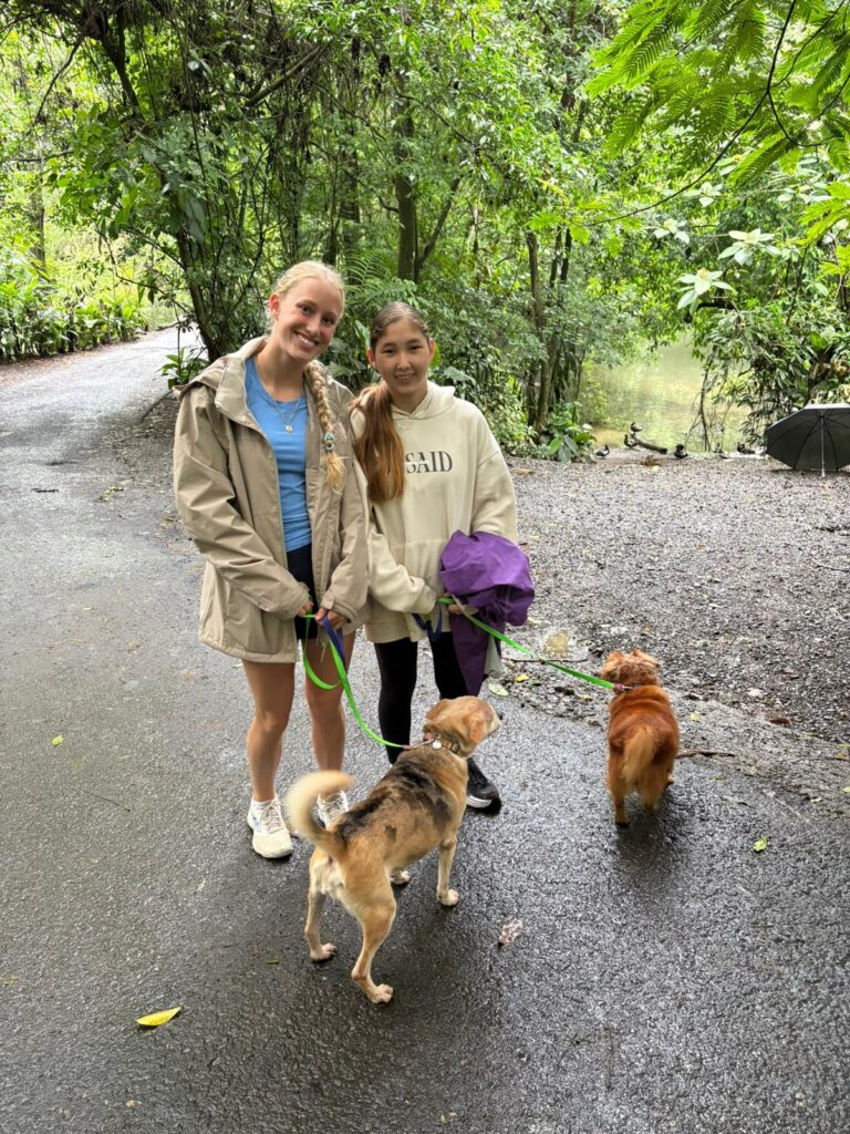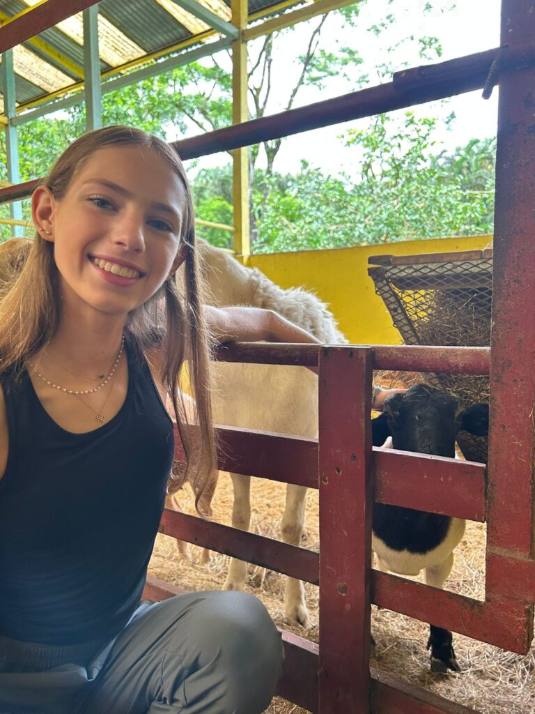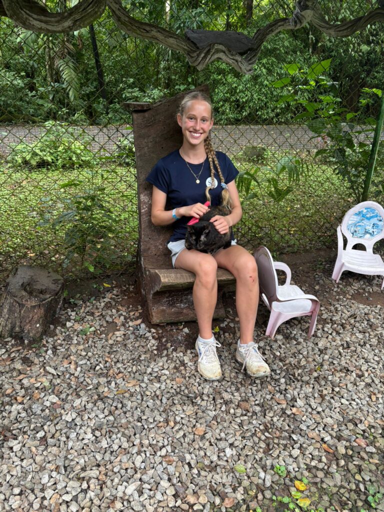 Hi it’s Lila! Today we woke up early cleaning trails for Lands in Love. Halfway through the hike we were led to a super pretty and humongous waterfall!!! We had such a fun time exploring and taking awesome pictures. After we had a great breakfast and some fun free time hanging out spent playing many rounds of werewolf with the group. Then we had an interesting lesson about phone use right before lunch. Later, we had an amazing tour of all the animals with one of the very sweet founders of the rescue. We saw all of their special needs animals and learned all about how they rescued them and now care for them. We even got to meet some of the paralyzed dogs and hear about their recovery journeys. We ended the night with dinner and reflecting on the animals with our mentor groups. We can’t wait for the next half of the trip!