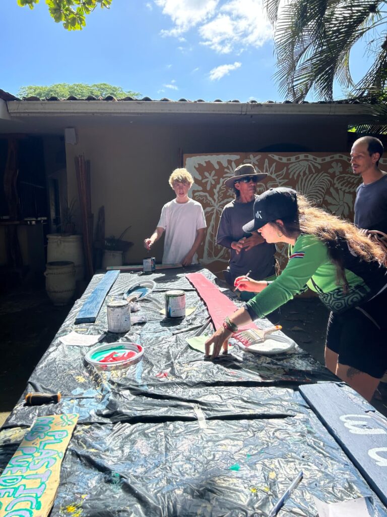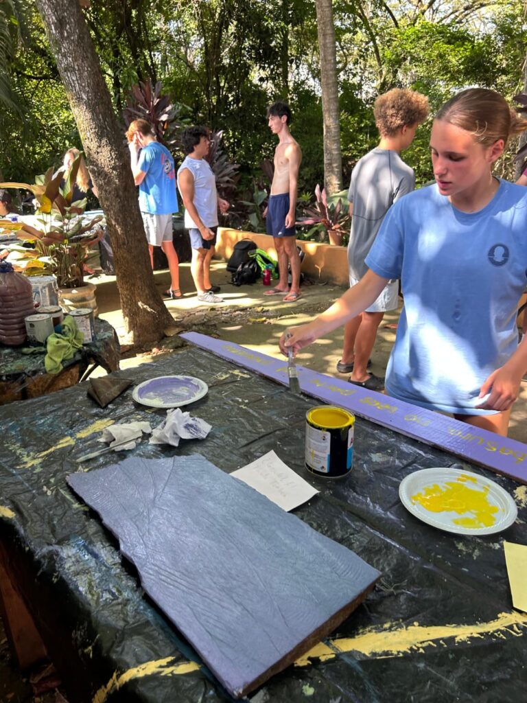 Today we had a late morning with a breakfast of omelette and fruit at 8:30. After breakfast we headed to our last surf lesson of the trip. It’s sad to see that this trip is coming to an end. After our lesson we headed back to the peace retreat for a yummy lunch of hamburgers. Following lunch we left to go do more service. We headed to Oropopo. There we painted signs to put up in n the area to raise awareness and spread messages to help the planet. After Oropopo we went back to the peace retreat.