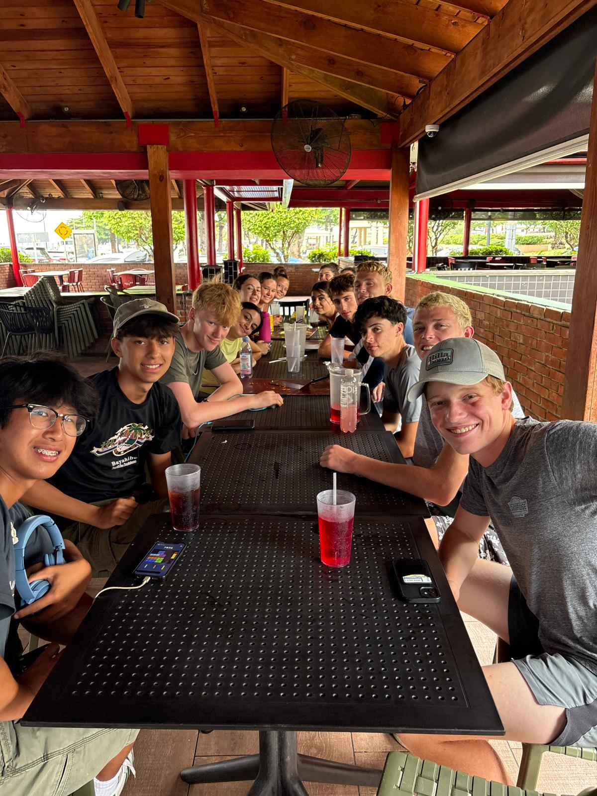 We had a slower morning waking around 8 for breakfast relative to the usual 7am. Then, we headed off to Hoyo Claro, a cenote near Punta Cana. Our bus ride was filled with games, stories, and music. On the hike to the cenote, we saw seven wild cows right on the trail while we were blasting music. At the cenote, we spent time jumping off rocks into the clear freshwater. Refreshing! We walked back to the bus after cooling off and headed back to the hotel before quickly trailing off to the local beach. On the way to the beach, we stopped for assorted tropical smoothies like mango, passionfruit, banana, and papaya. At the beach, we swam in the shallow water playing various games although it was a bit rocky. We got to see a little bit of the local life and bustling streets. We headed back to the hotel to change and get ready to go out to our first dinner out with an amazing view of the bay. Later in the night, we had a student debate about social issues where we educated ourselves on other points of view.