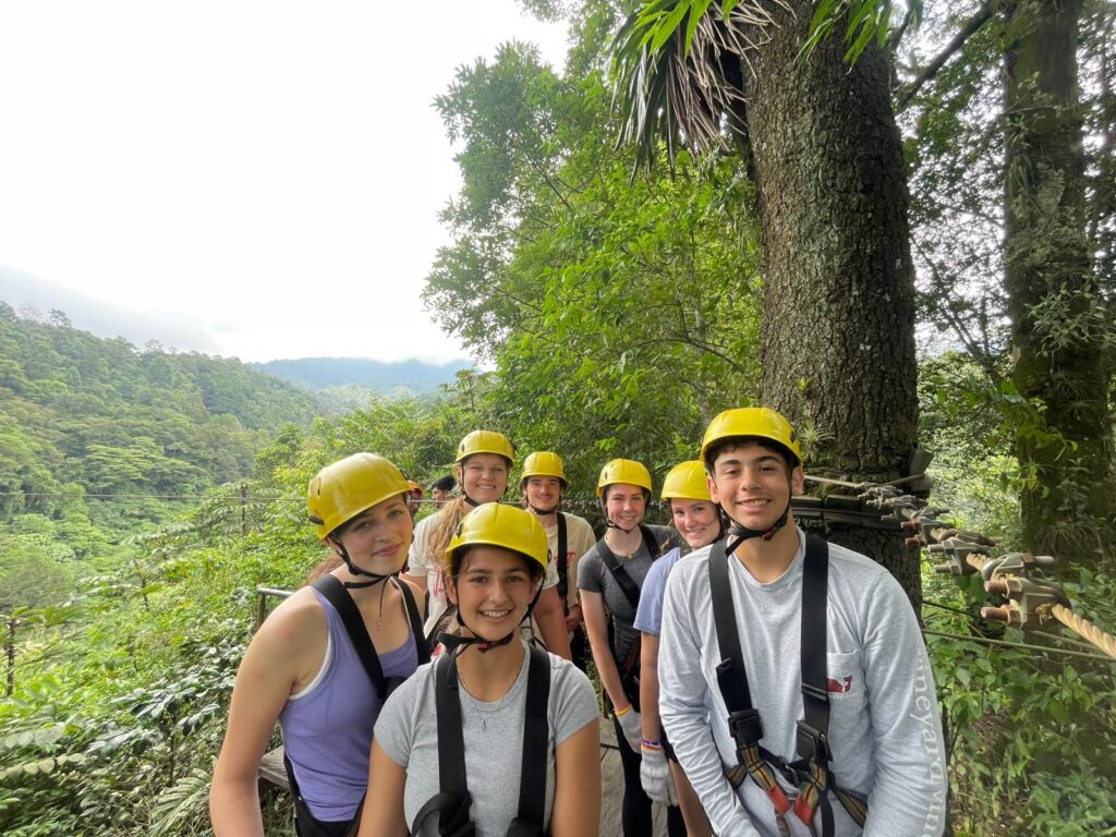Hey! Today we started off the day with breakfast at 7 am and then headed to the bus to have our activity of the morning: ZIPLINING! Everyone was so excited and the bus ride was full of singalong songs as we drove to the course. When we got there, we split into our mentor groups to go up to the zip lines and both groups did 10 zip lines. It was so fun and had amazing views of mountains to look over.